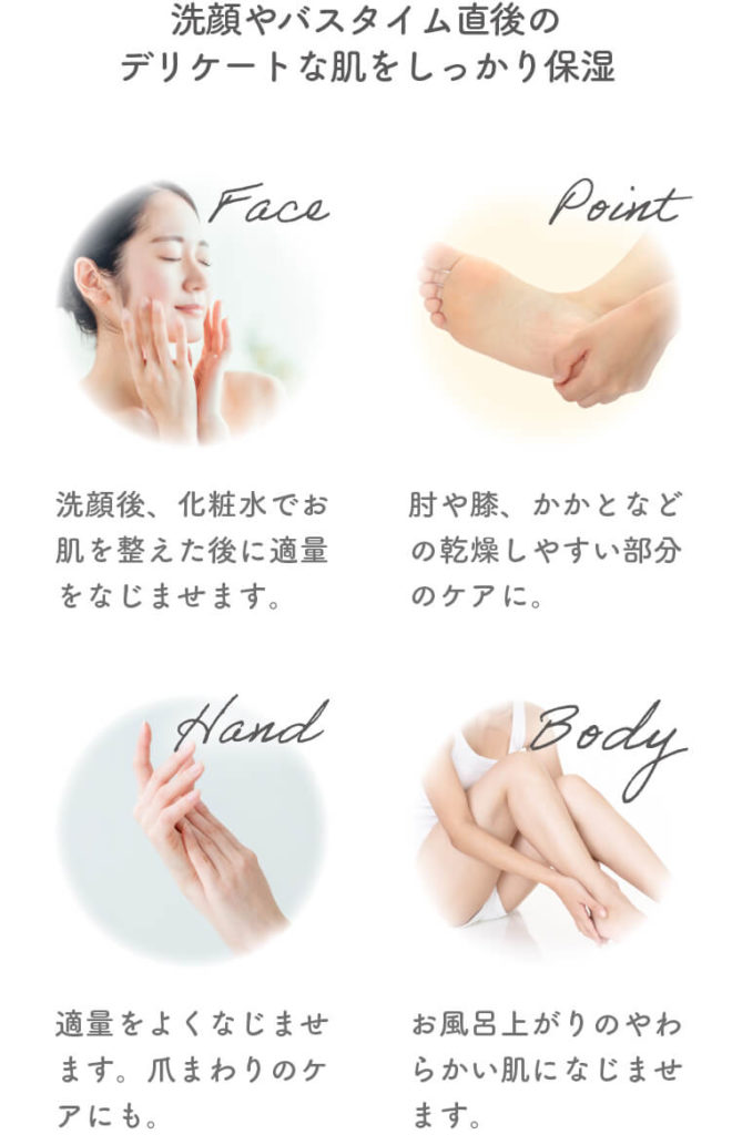 - 浸透性:角質層のすみずみまで浸透し、べたつかずに滑らかに仕上がります。